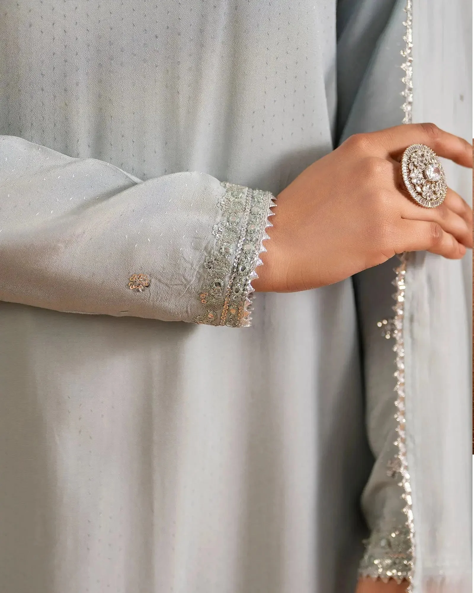 The imported silk fabric offers a naturally lustrous drape and feather-light comfort, ensuring you look and feel magnificent throughout the event. The crinkle chiffon dupatta adds effortless grace and movement to complete the three-piece ensemble.