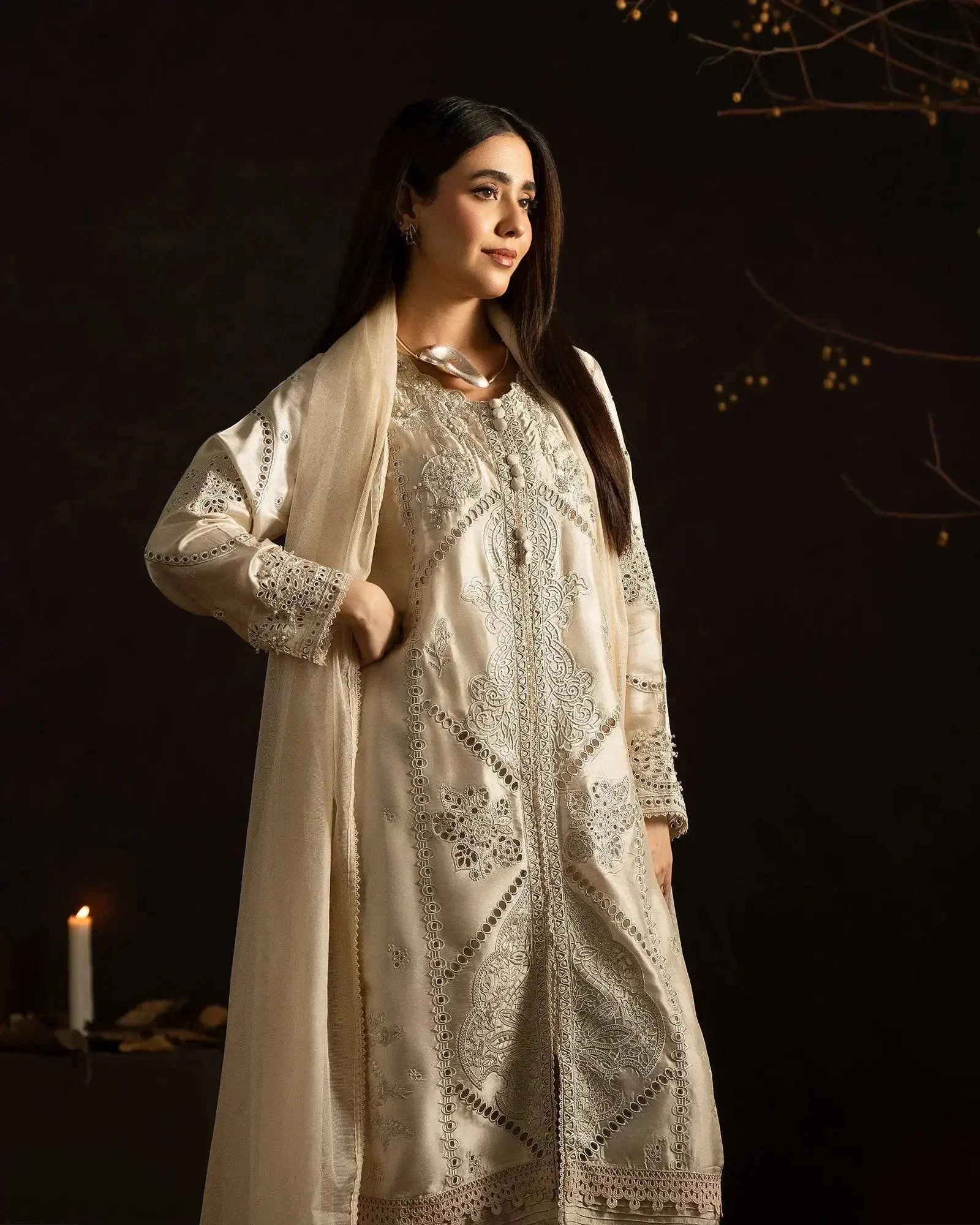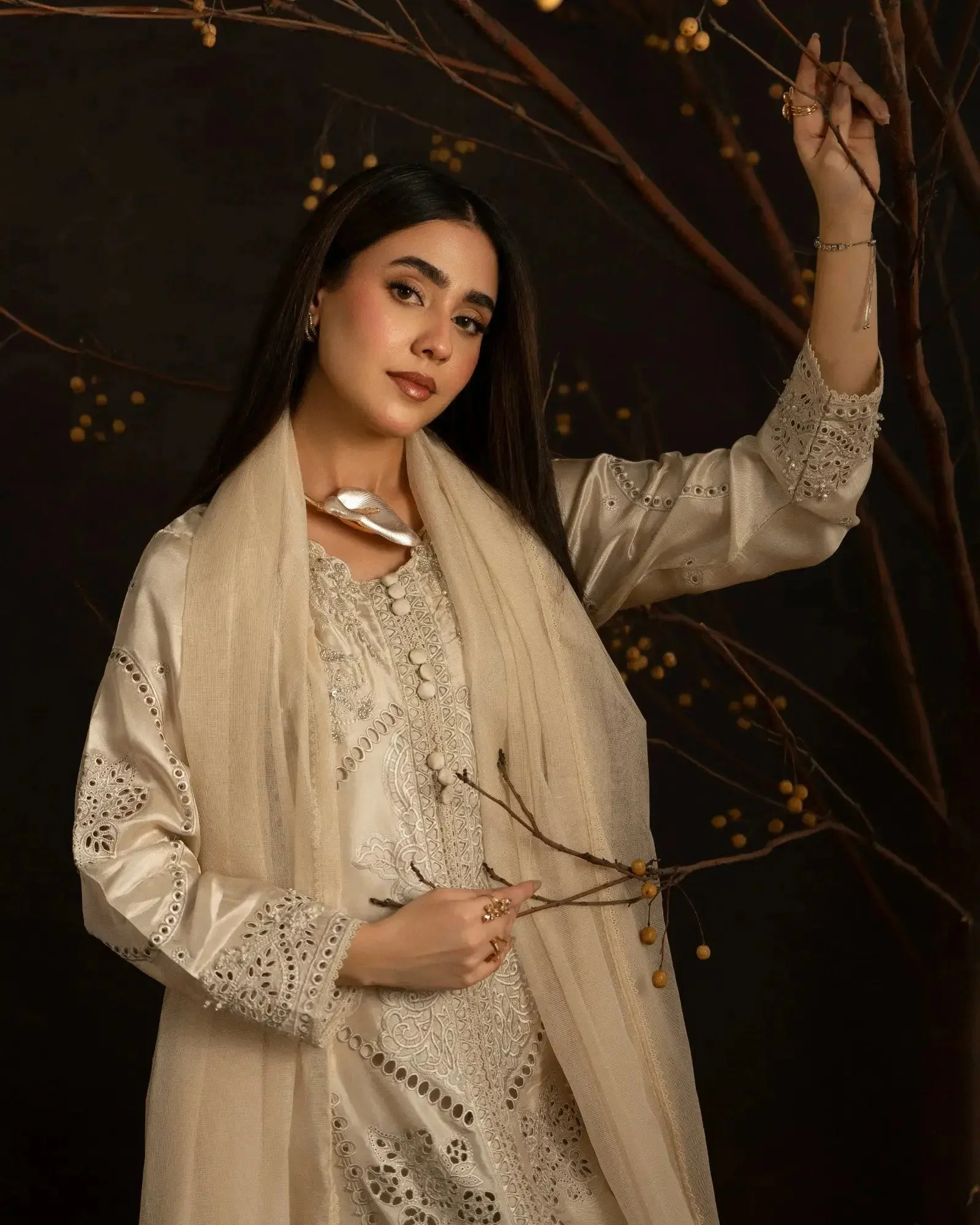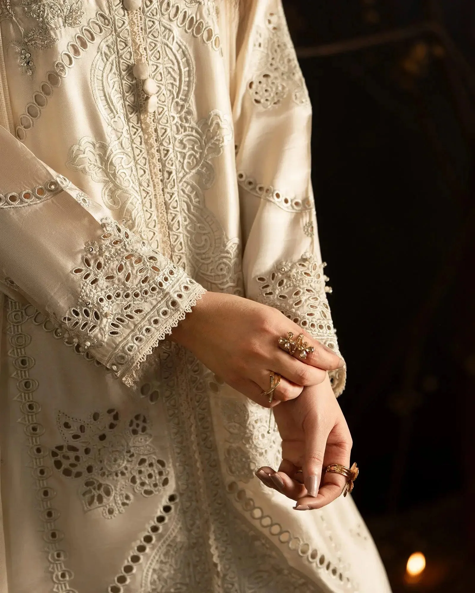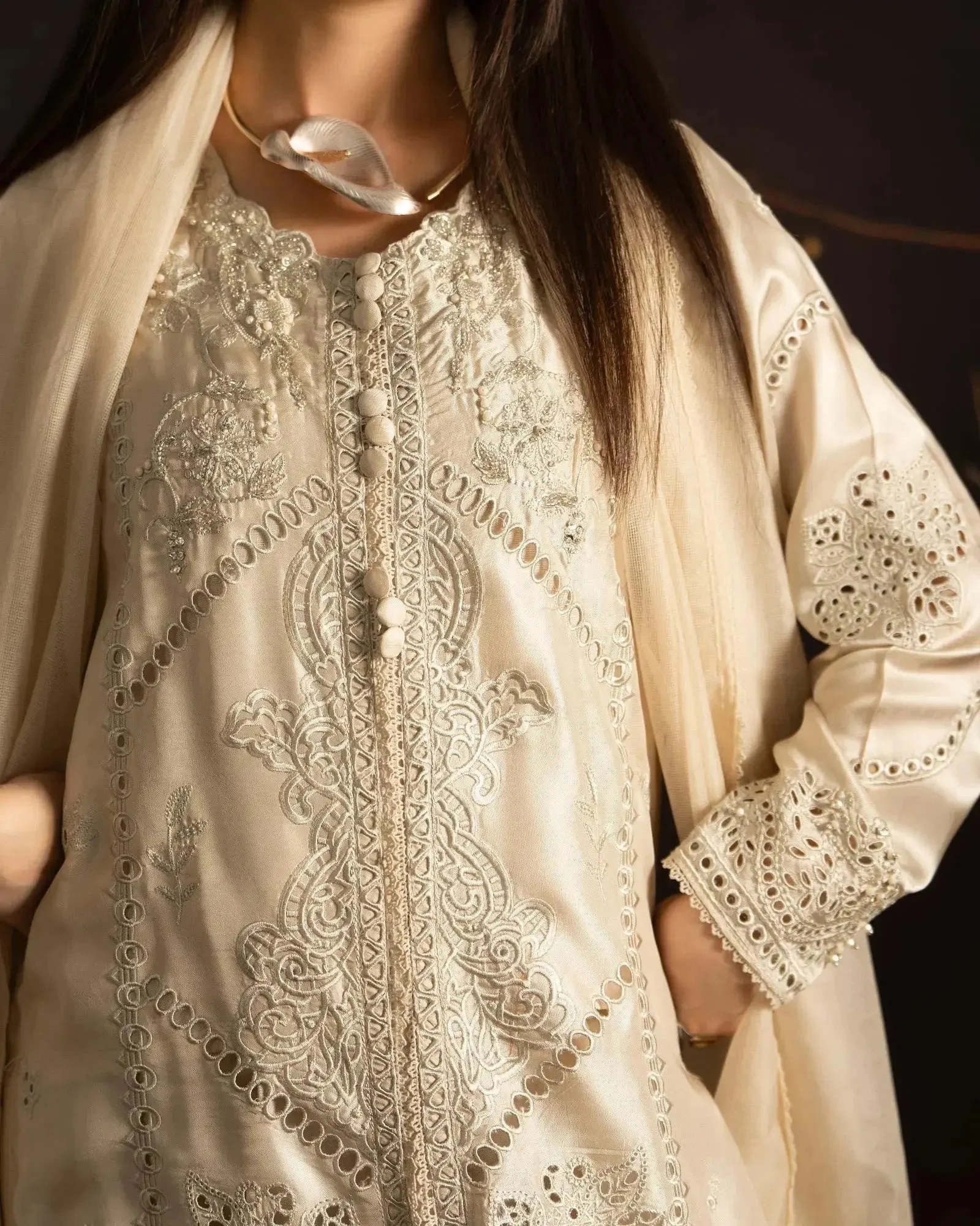 This versatile formal wear piece transitions effortlessly from daytime celebrations to evening soirées. Pair with strappy heeled sandals and pearl drop earrings to let the intricate embroidery take center stage. The Ivory colorway offers a classic bridal-adjacent look, while Soft Pink radiates warmth and femininity — both equally stunning under event lighting.