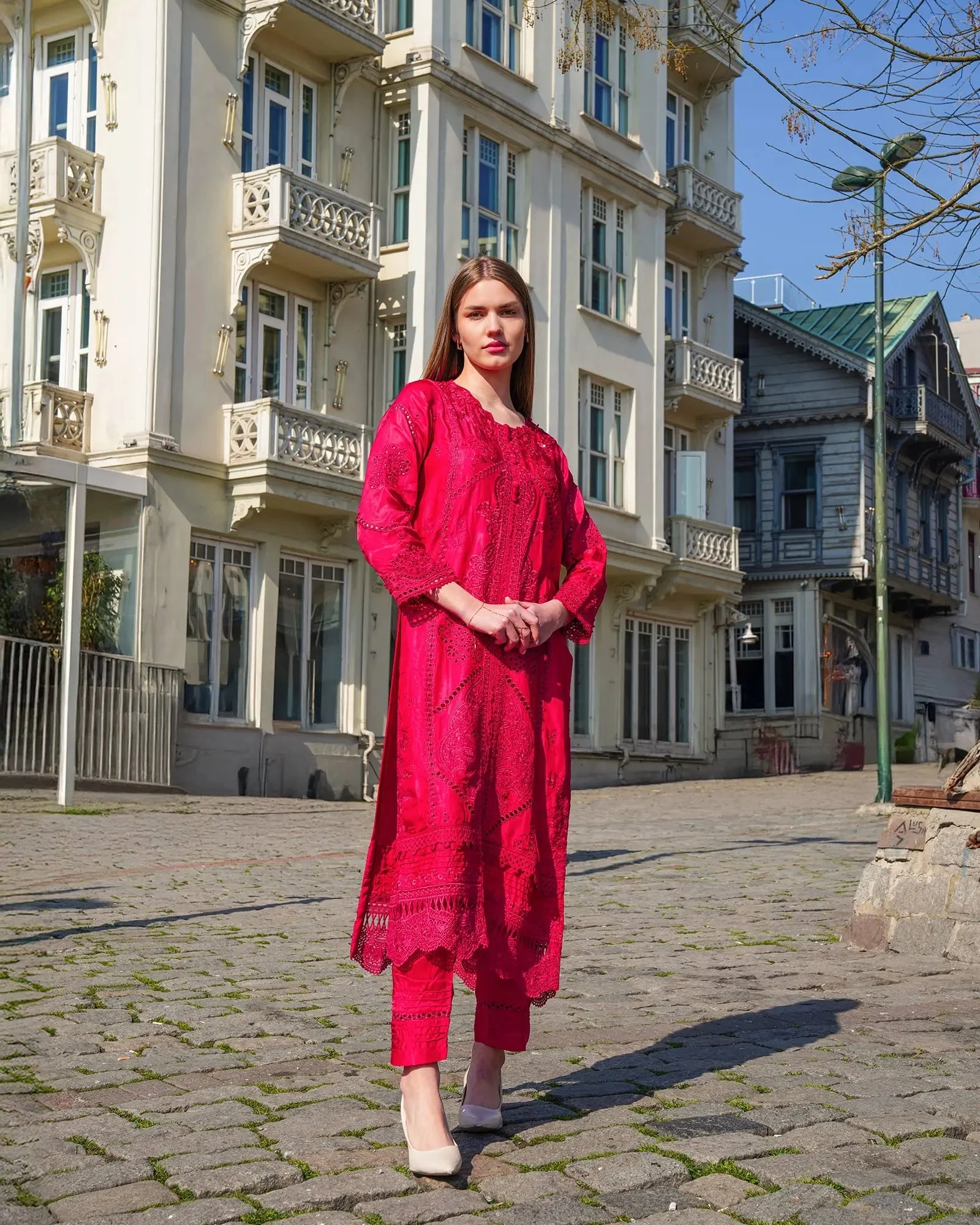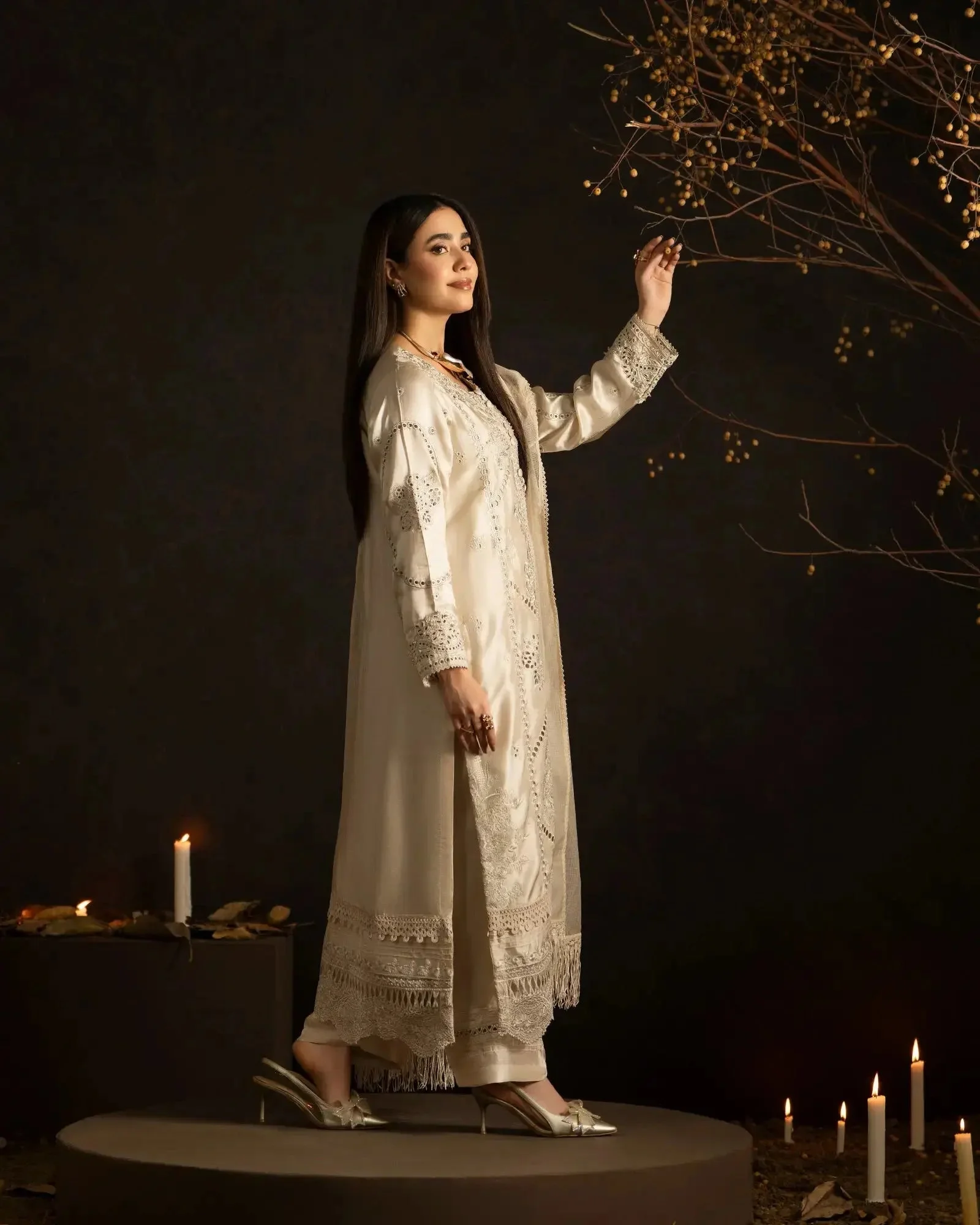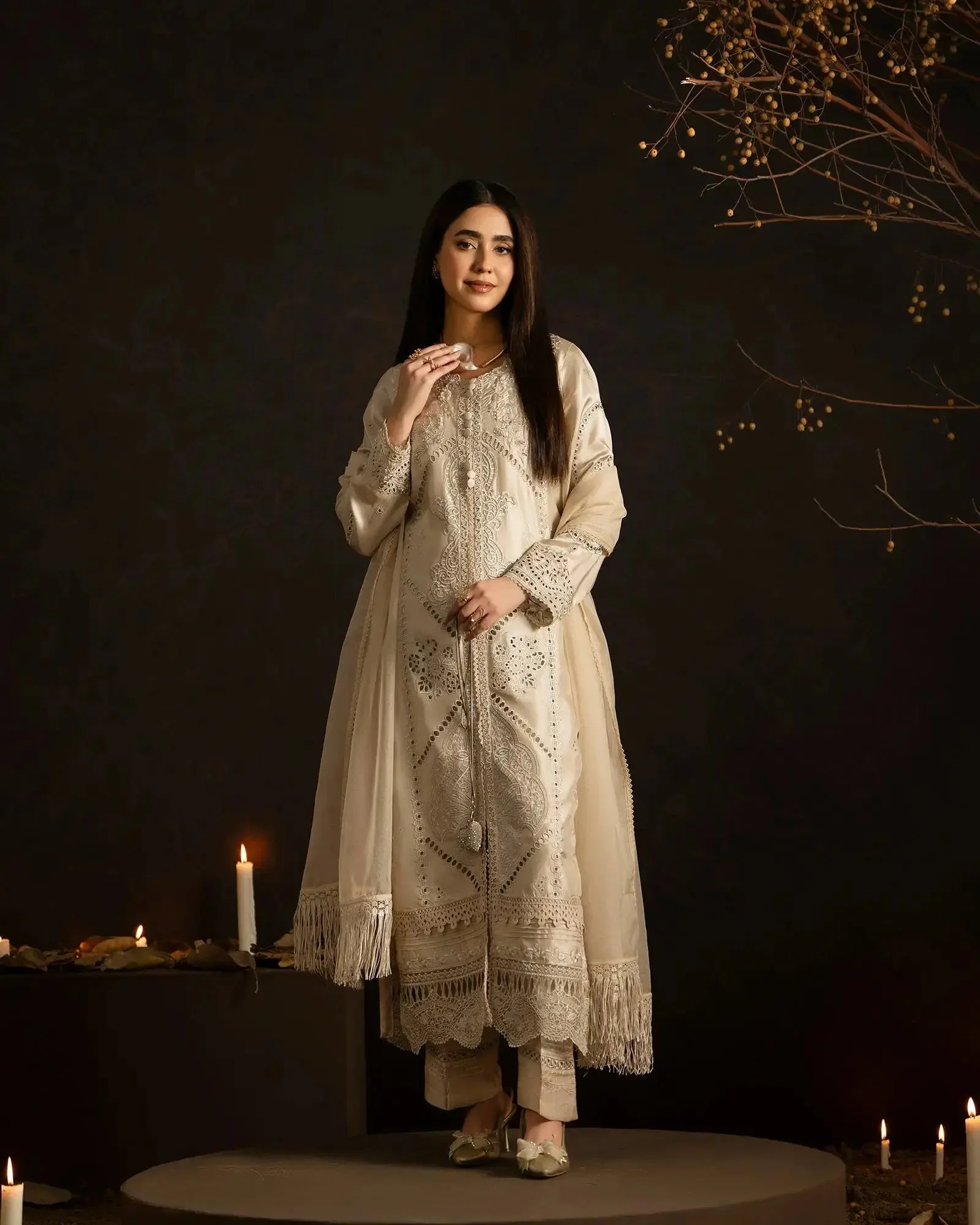 This versatile formal wear piece transitions effortlessly from daytime celebrations to evening soirées. Pair with strappy heeled sandals and pearl drop earrings to let the intricate embroidery take center stage. The Ivory colorway offers a classic bridal-adjacent look, while Soft Pink radiates warmth and femininity — both equally stunning under event lighting.