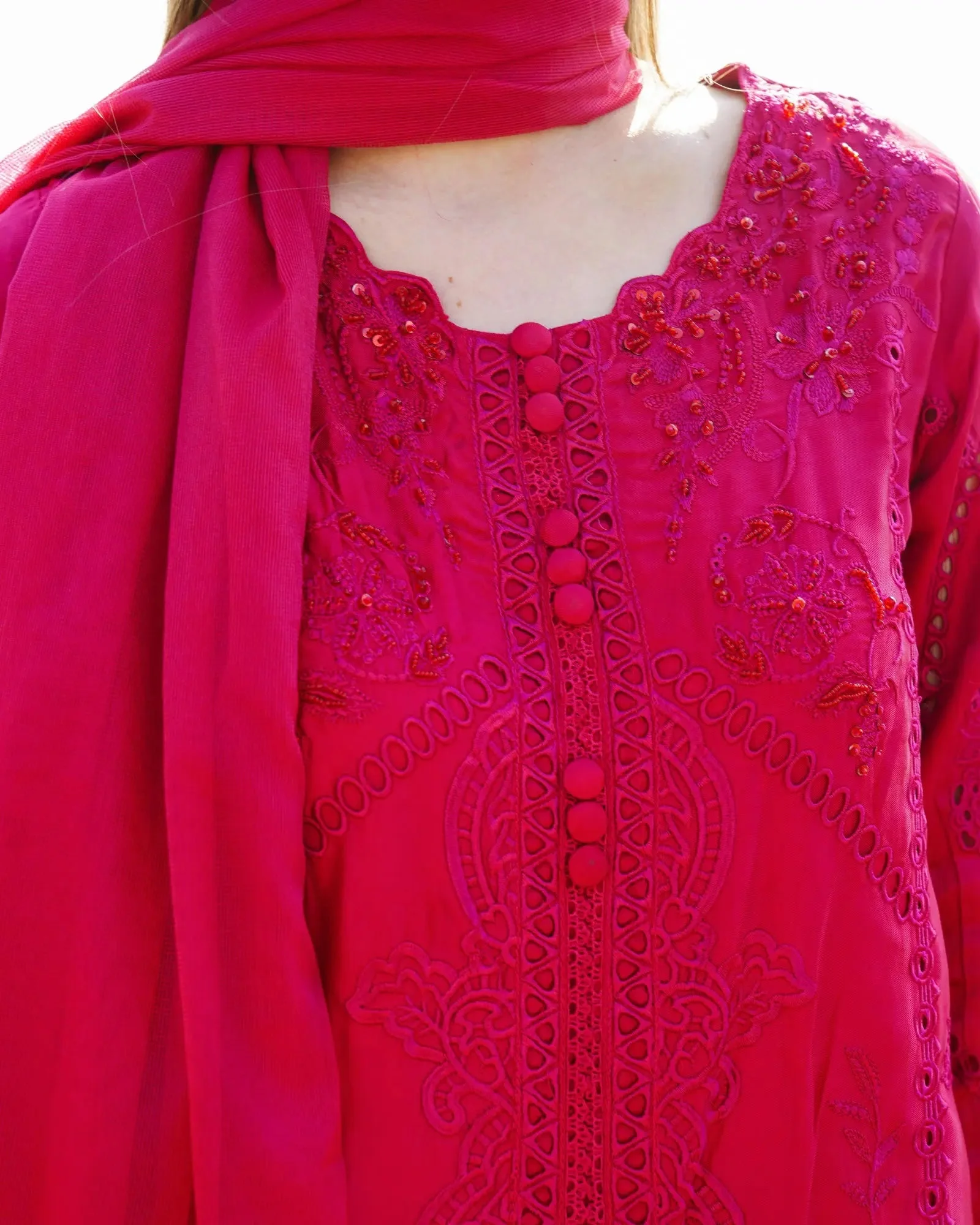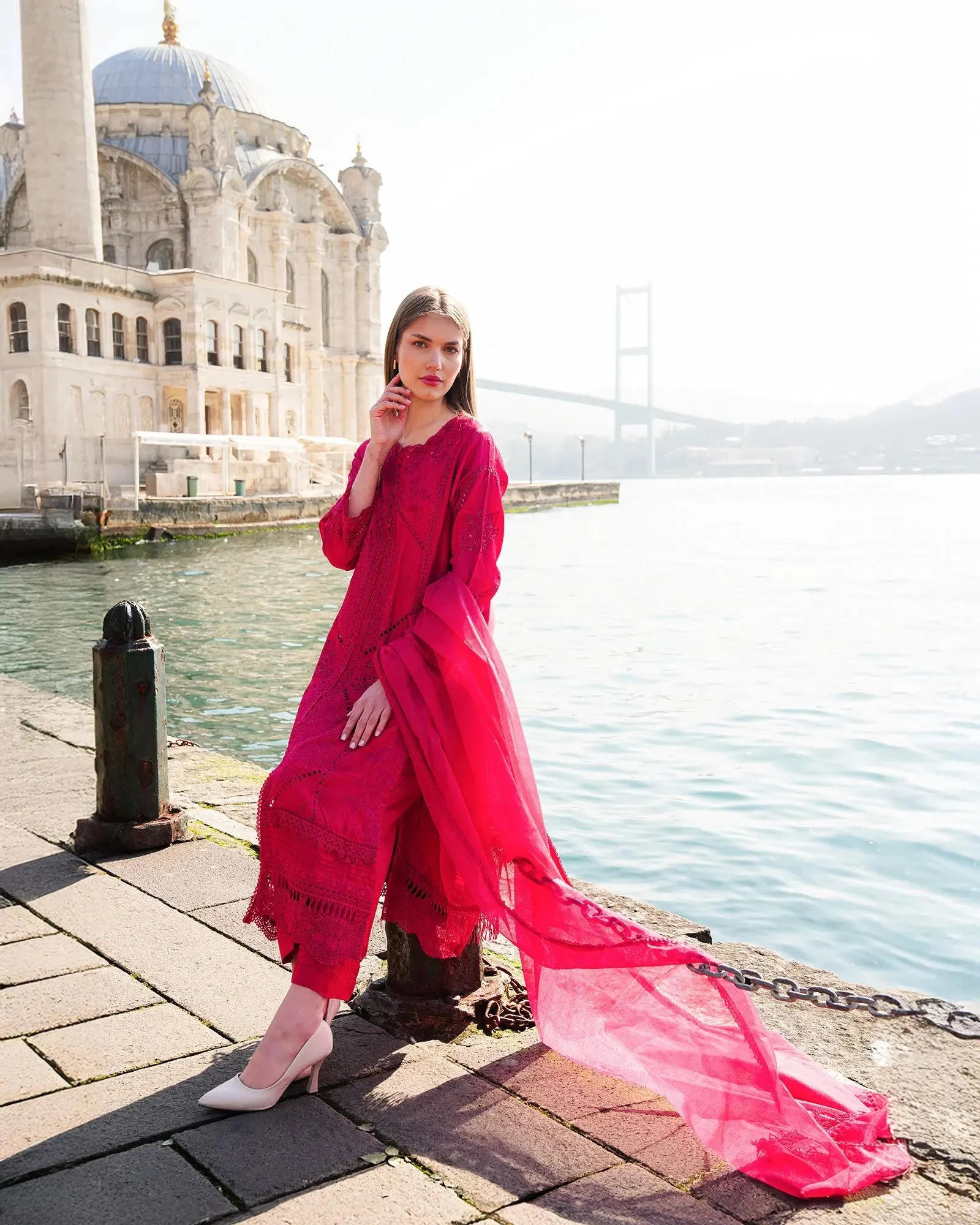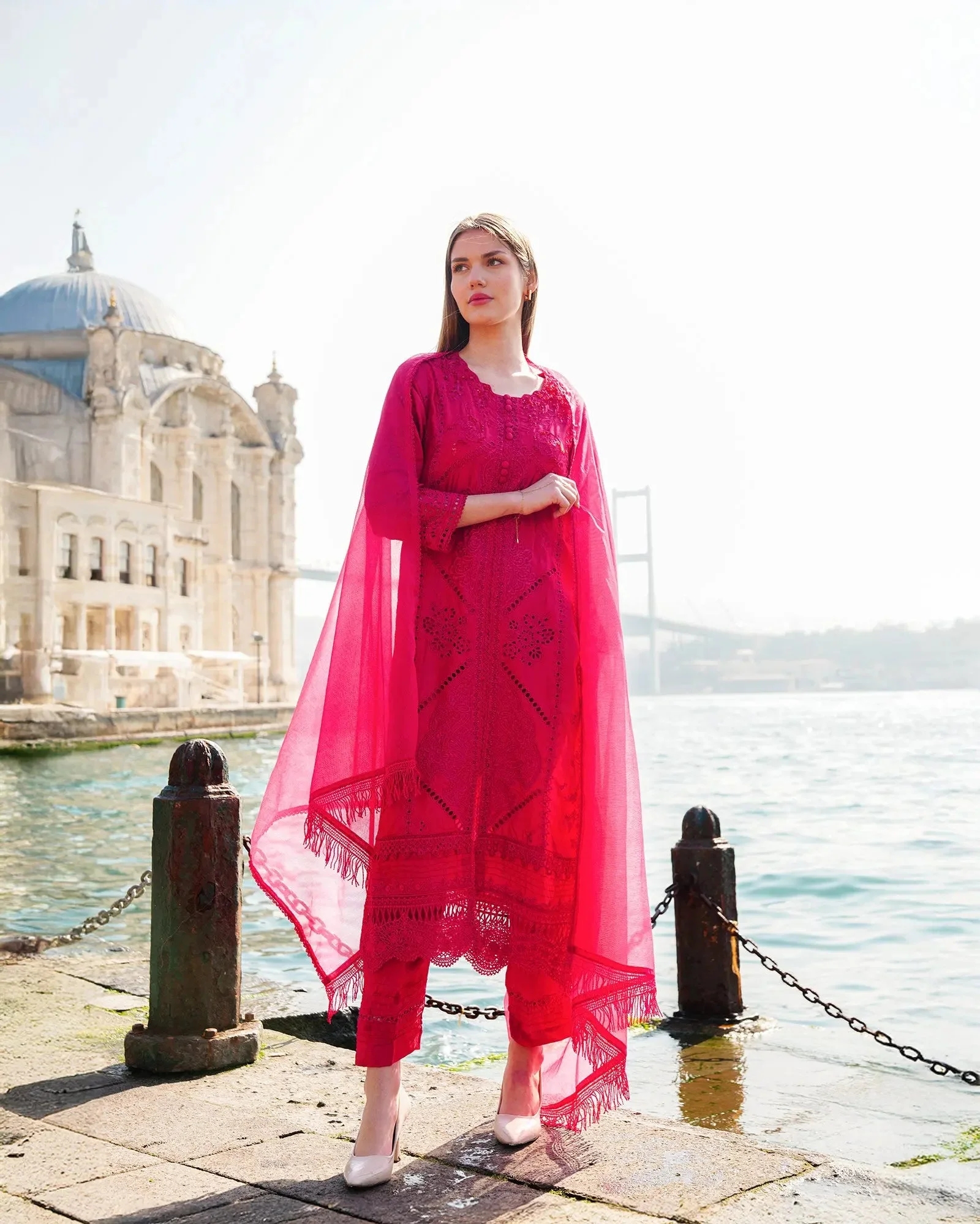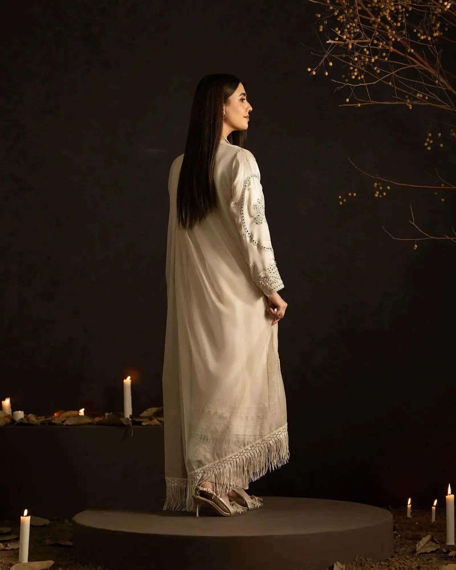 This versatile formal wear piece transitions effortlessly from daytime celebrations to evening soirées. Pair with strappy heeled sandals and pearl drop earrings to let the intricate embroidery take center stage. The Ivory colorway offers a classic bridal-adjacent look, while Soft Pink radiates warmth and femininity — both equally stunning under event lighting.