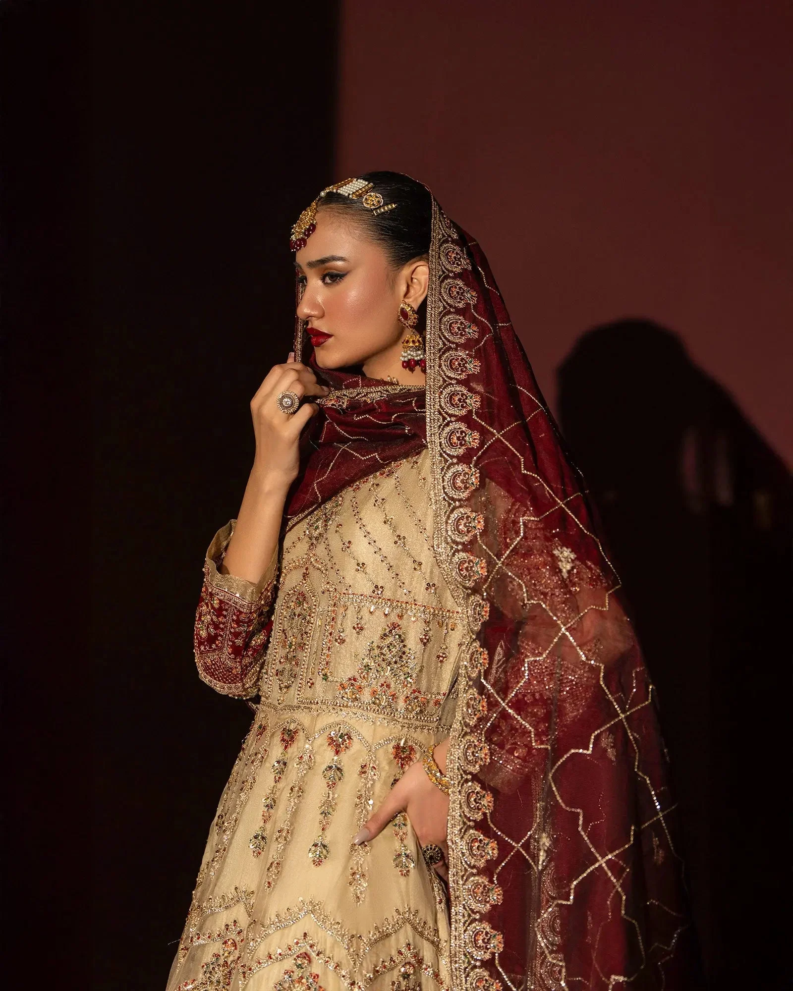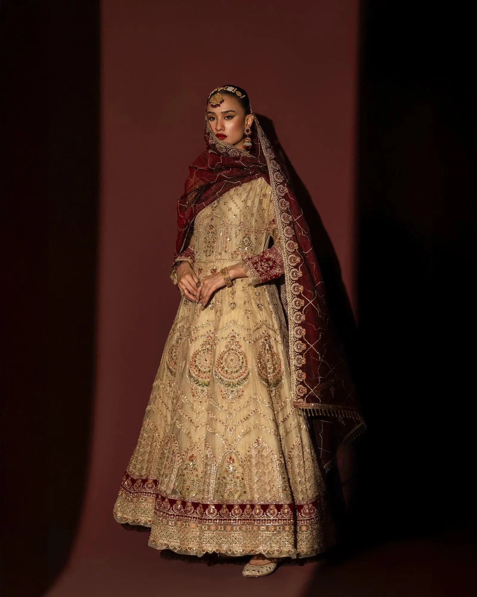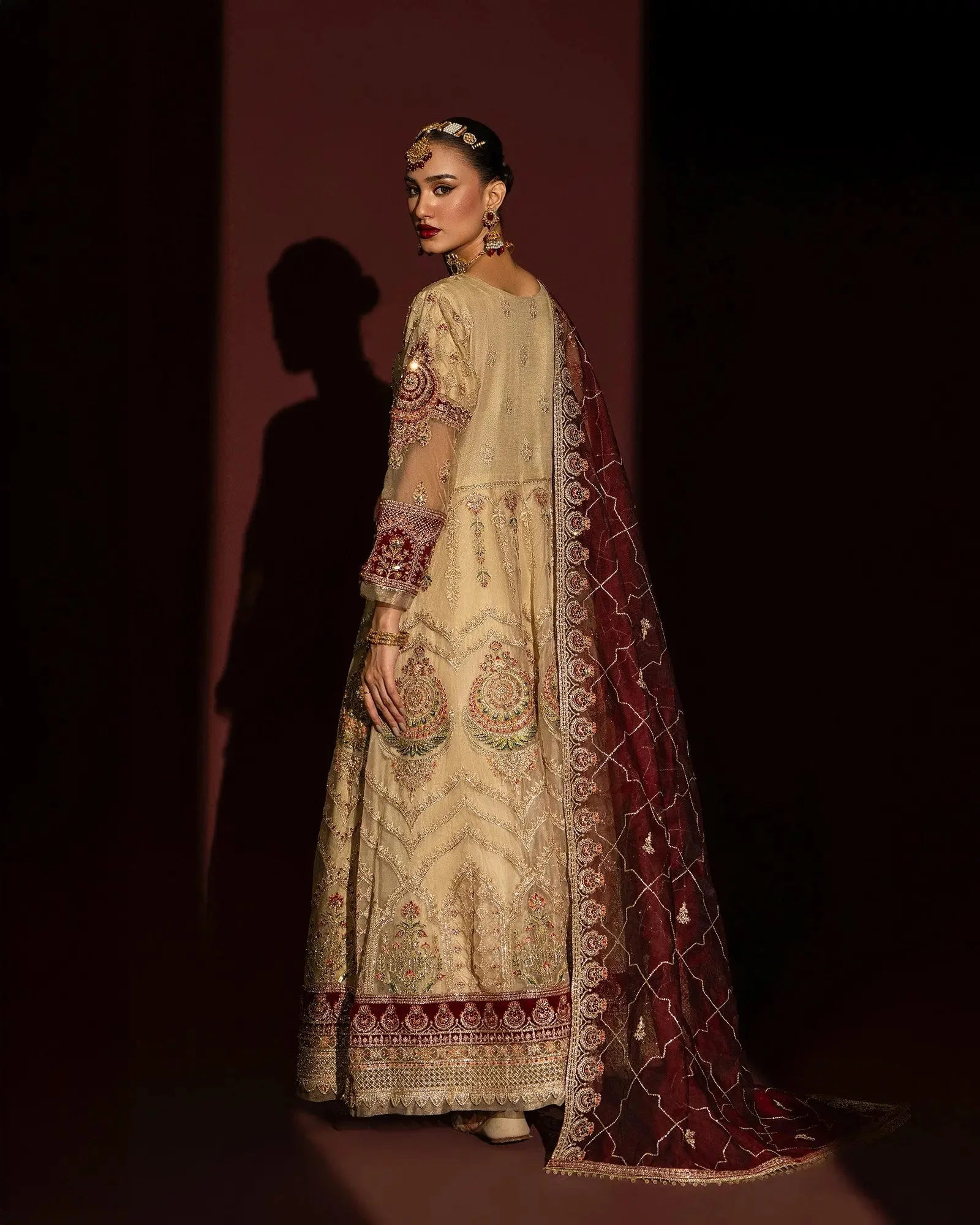 This Sha Posh formal maxi is designed with an eye for understated grandeur. The soft skin tone palette is universally flattering, lending a radiant warmth to any complexion. The silhouette follows a classic formal gown cut that is both modest and breathtakingly elegant — a hallmark of original Sha Posh collection aesthetics that have made the brand a coveted name in Pakistani designer fashion.