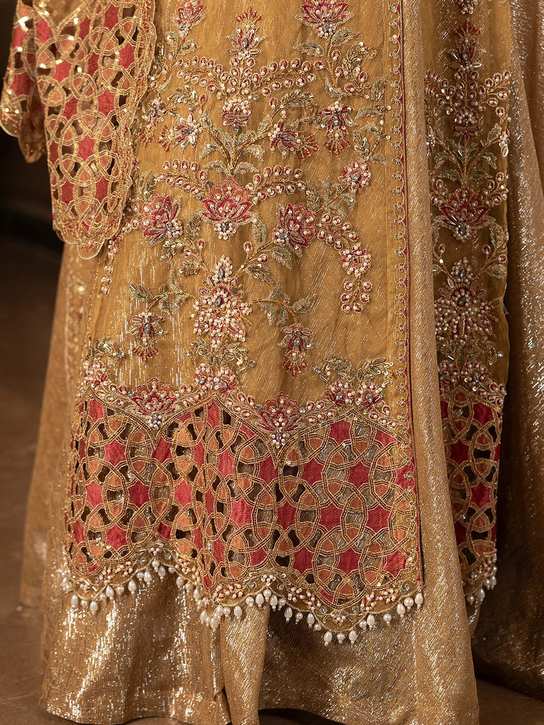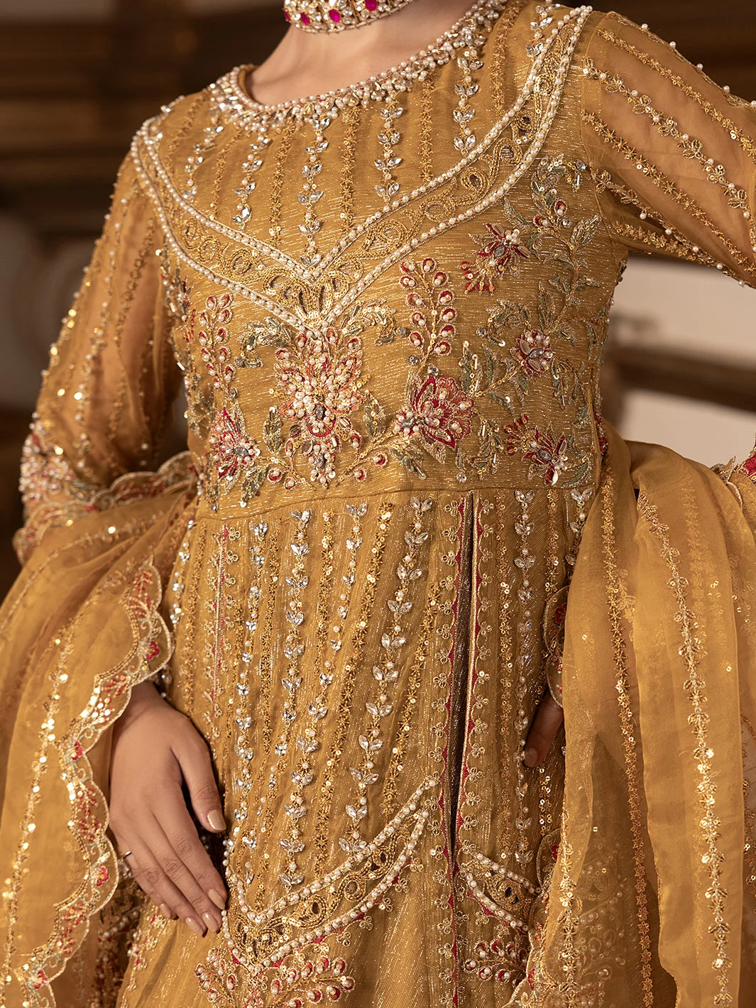 • Dupatta: Organza with embroidery, stonework, tilla, and laser-cut detailing