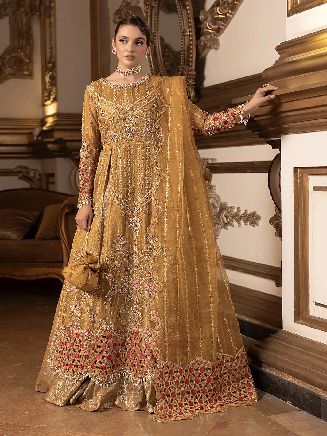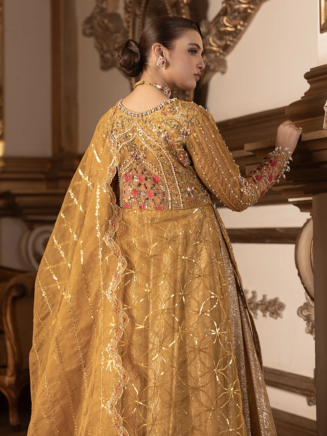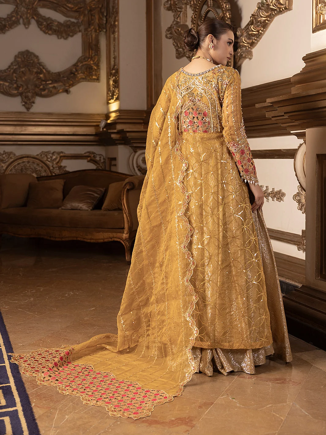 Pair this Pakistani designer formal wear masterpiece with statement gold or kundan jewellery to complement the mustard palette. Nude or gold strappy heels will elongate the silhouette, while a sleek updo will showcase the dupatta’s intricate embroidery. Keep accessories minimal — this dress is designed to be the star.