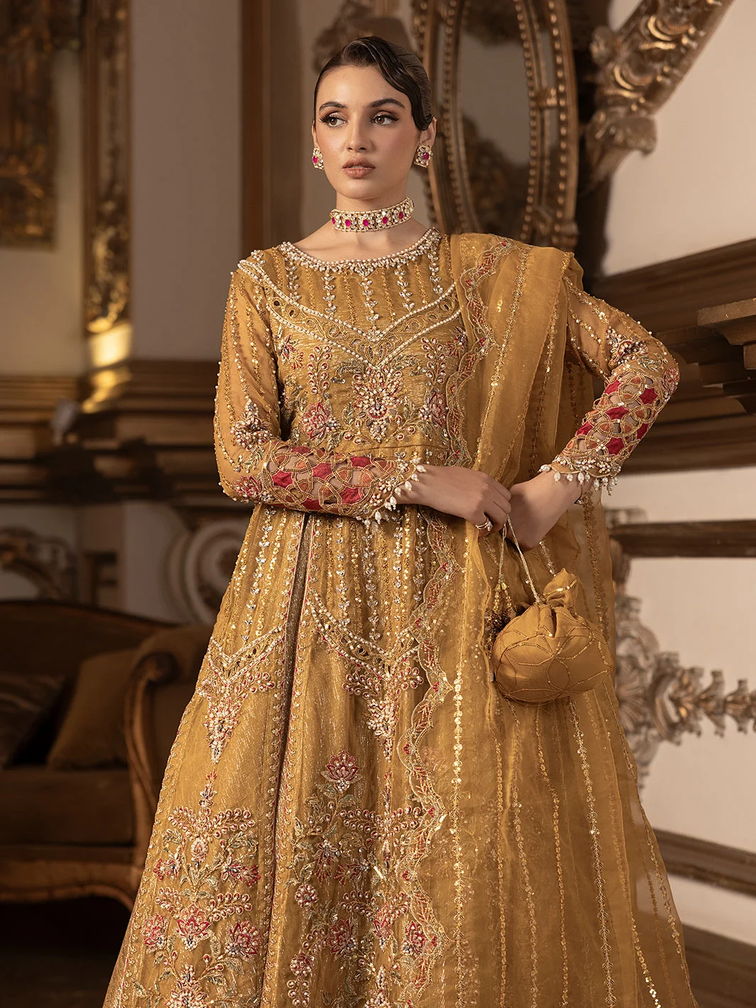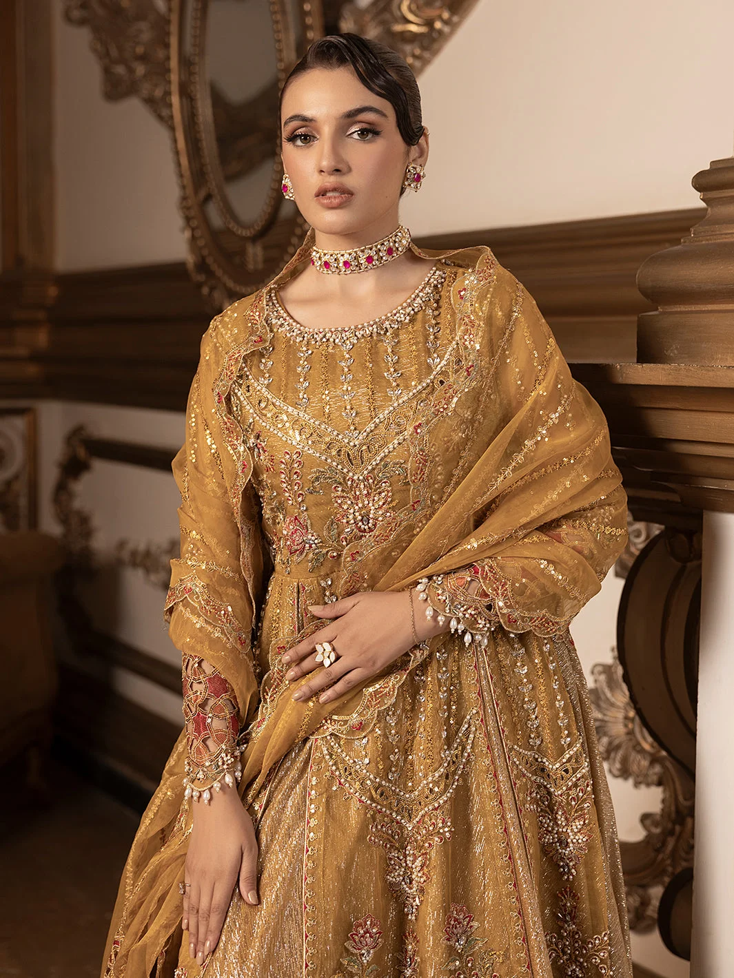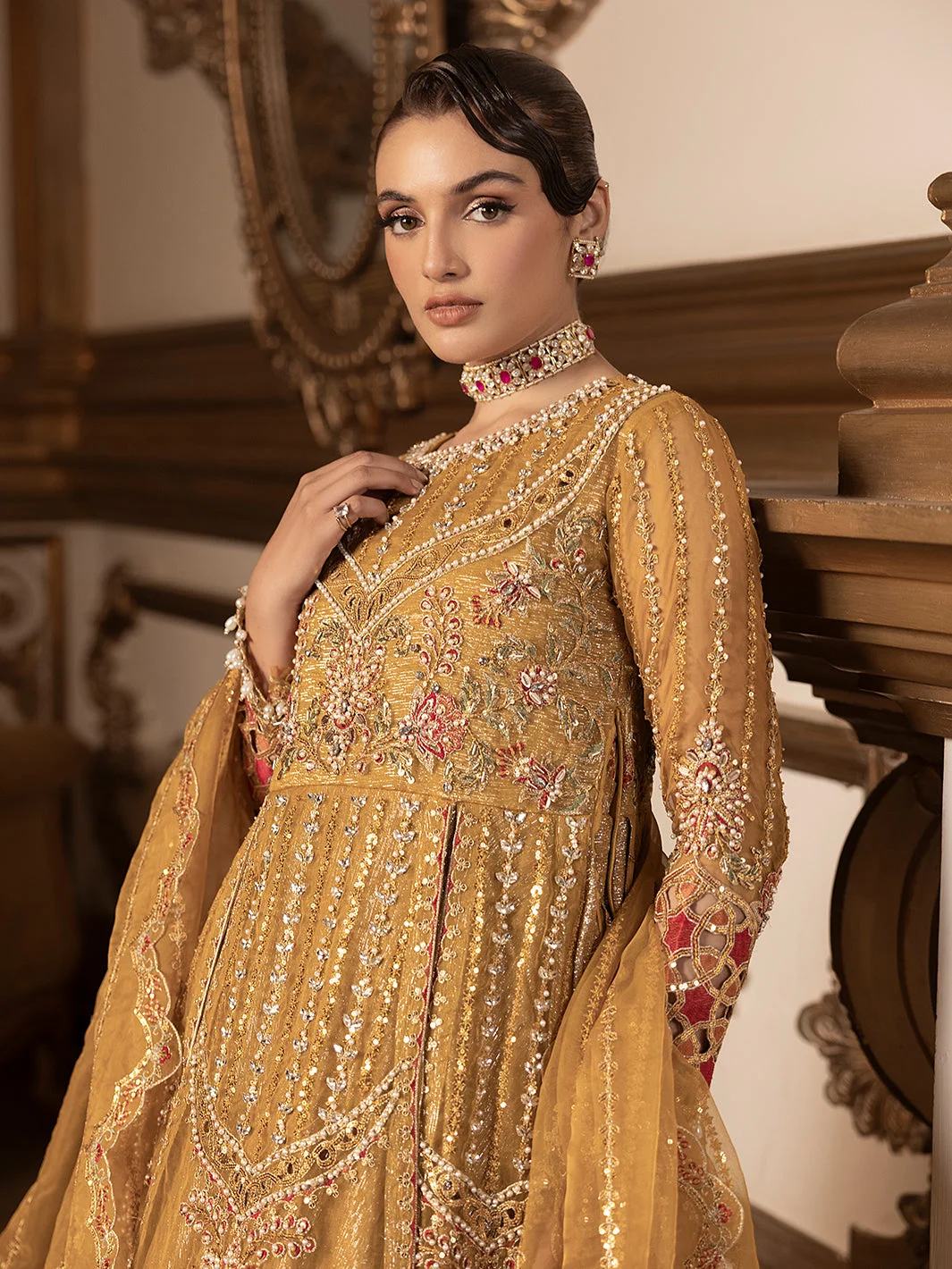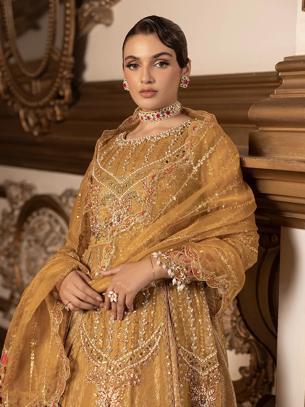 Pair this Pakistani designer formal wear masterpiece with statement gold or kundan jewellery to complement the mustard palette. Nude or gold strappy heels will elongate the silhouette, while a sleek updo will showcase the dupatta’s intricate embroidery. Keep accessories minimal — this dress is designed to be the star.