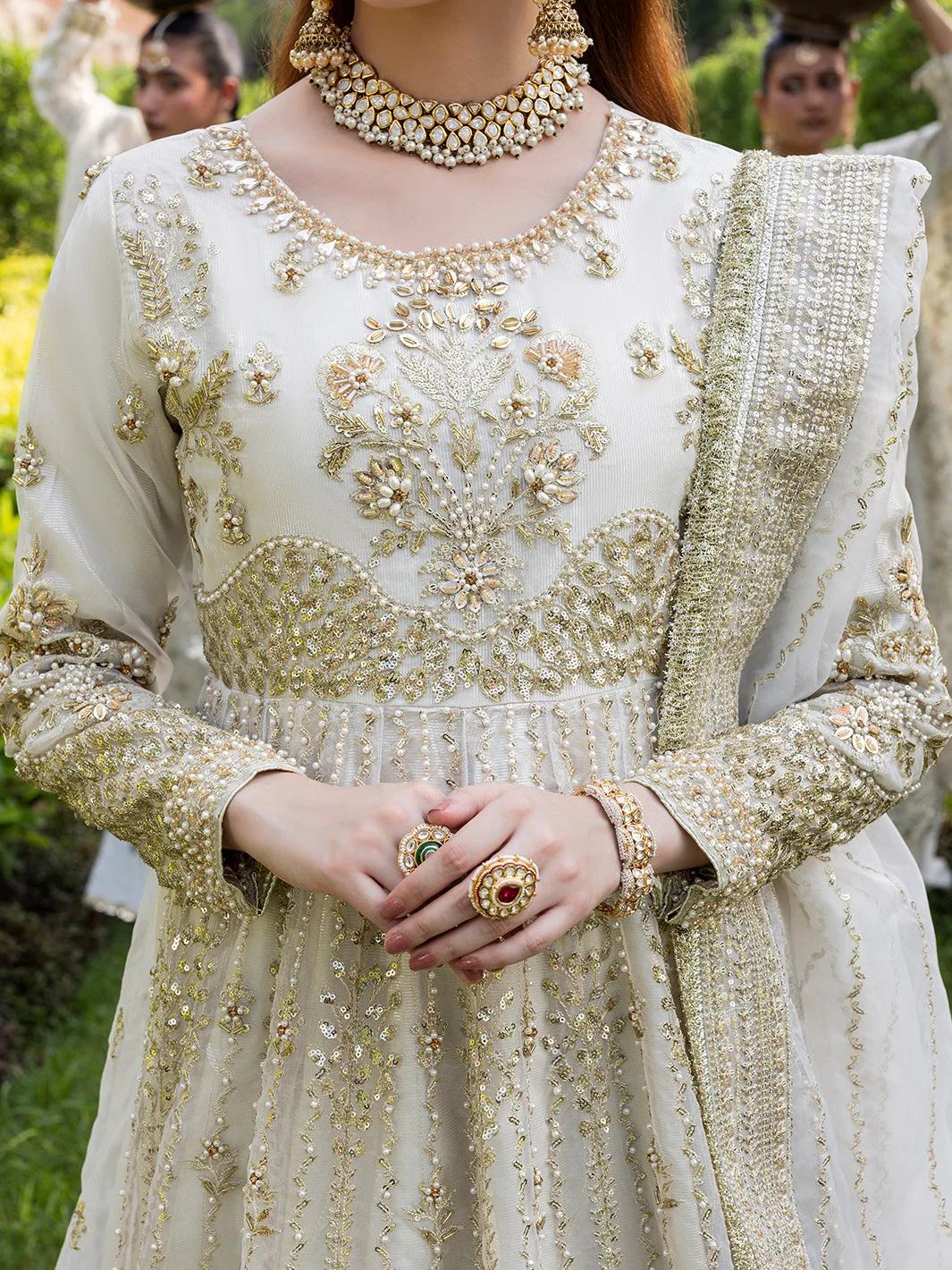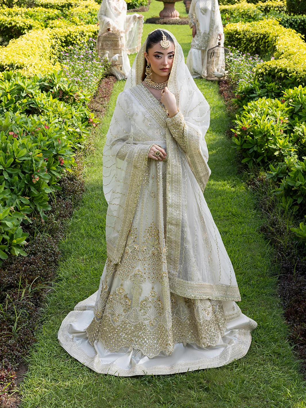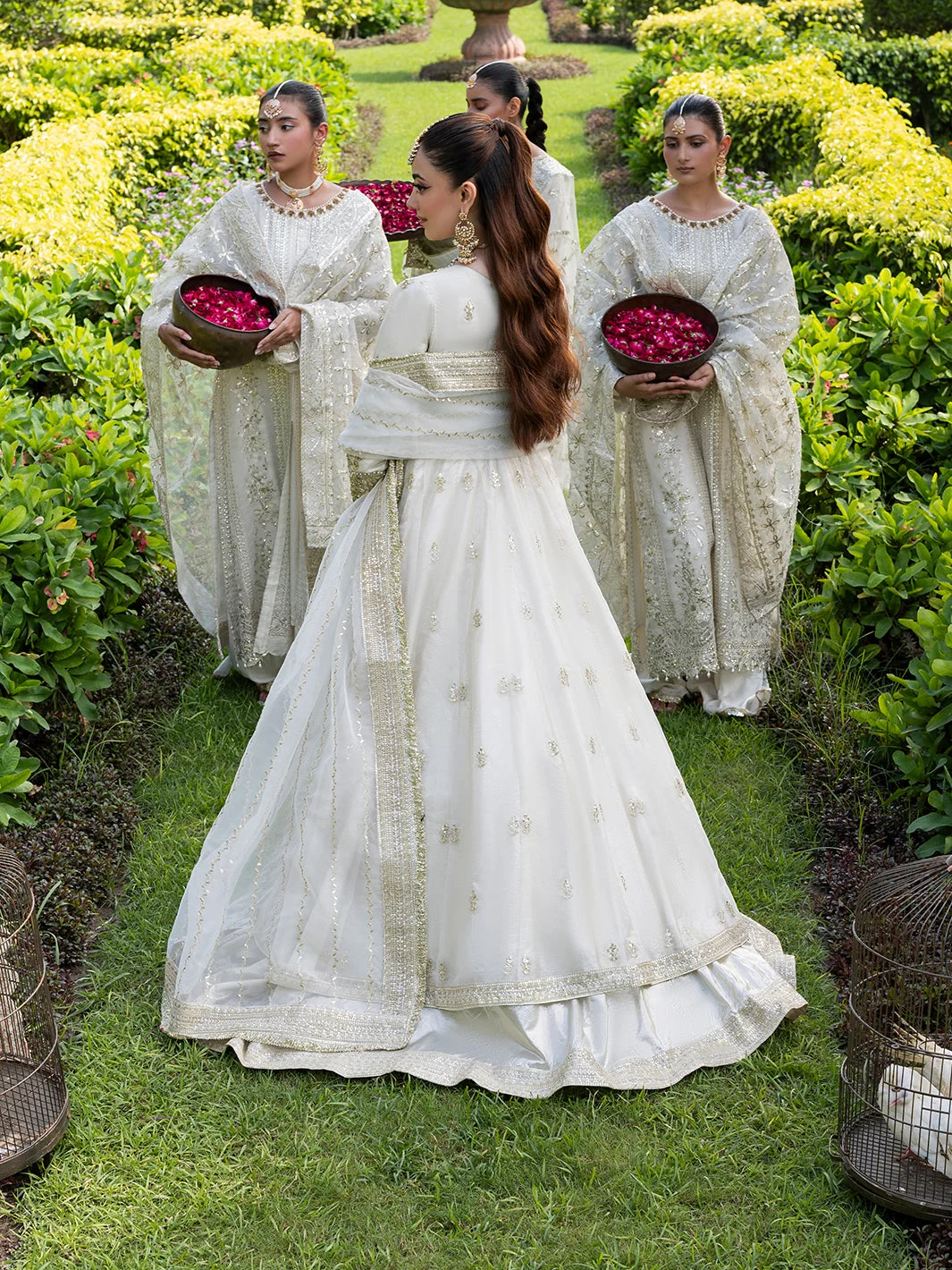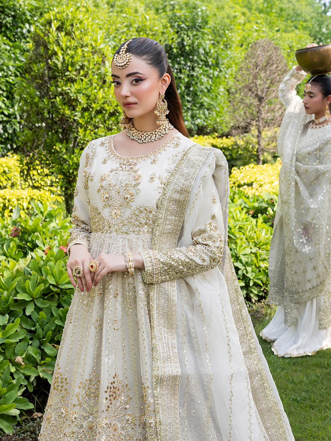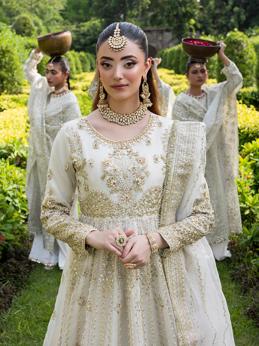 Pair this Pakistani designer fashion masterpiece with statement chandelier earrings in gold or kundan for a fully bridal-adjacent look. A sleek low bun or voluminous waves complement the maxi’s neckline beautifully. Opt for embellished heels in gold or nude to let the lehenga’s flare take centre stage.