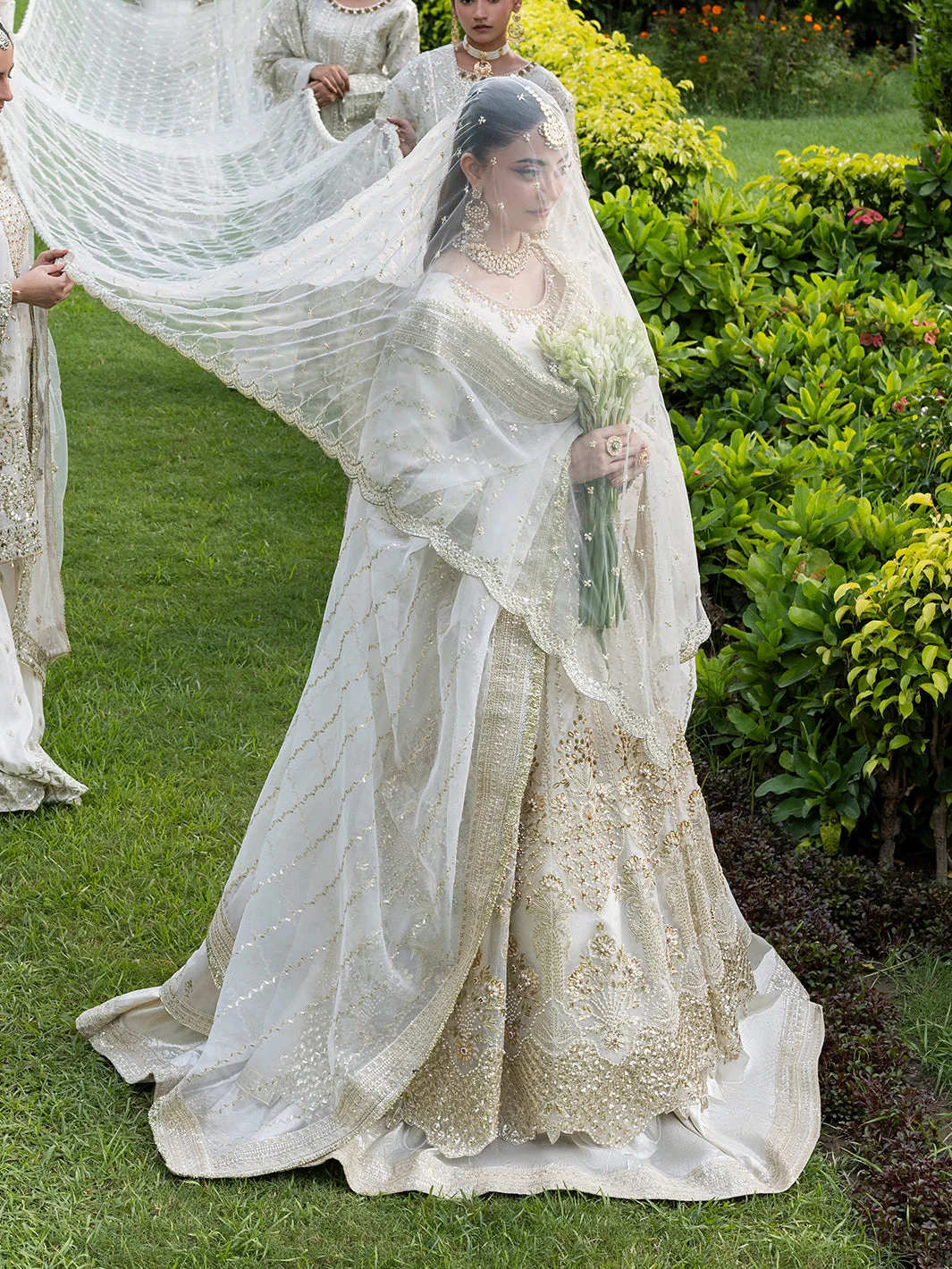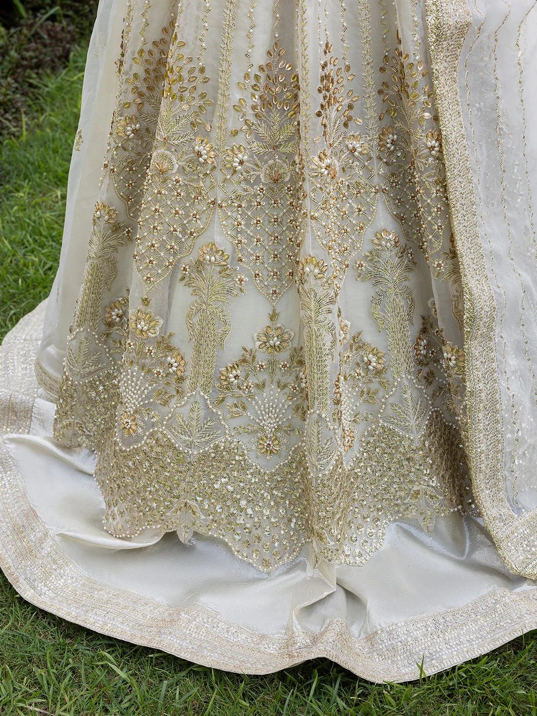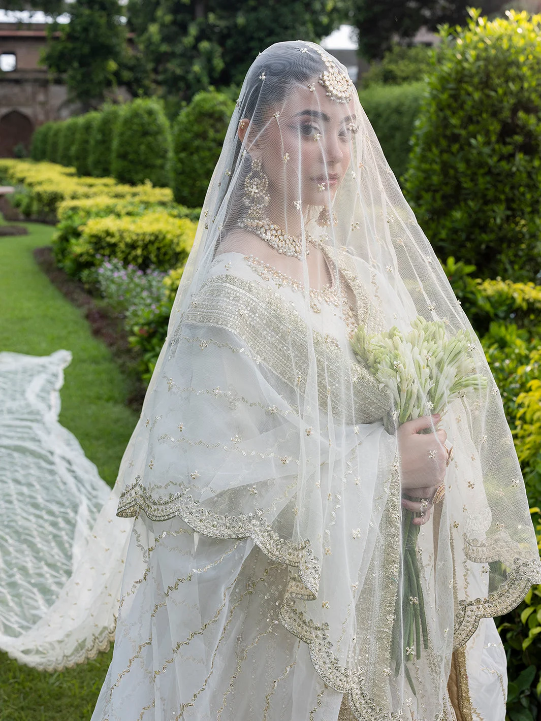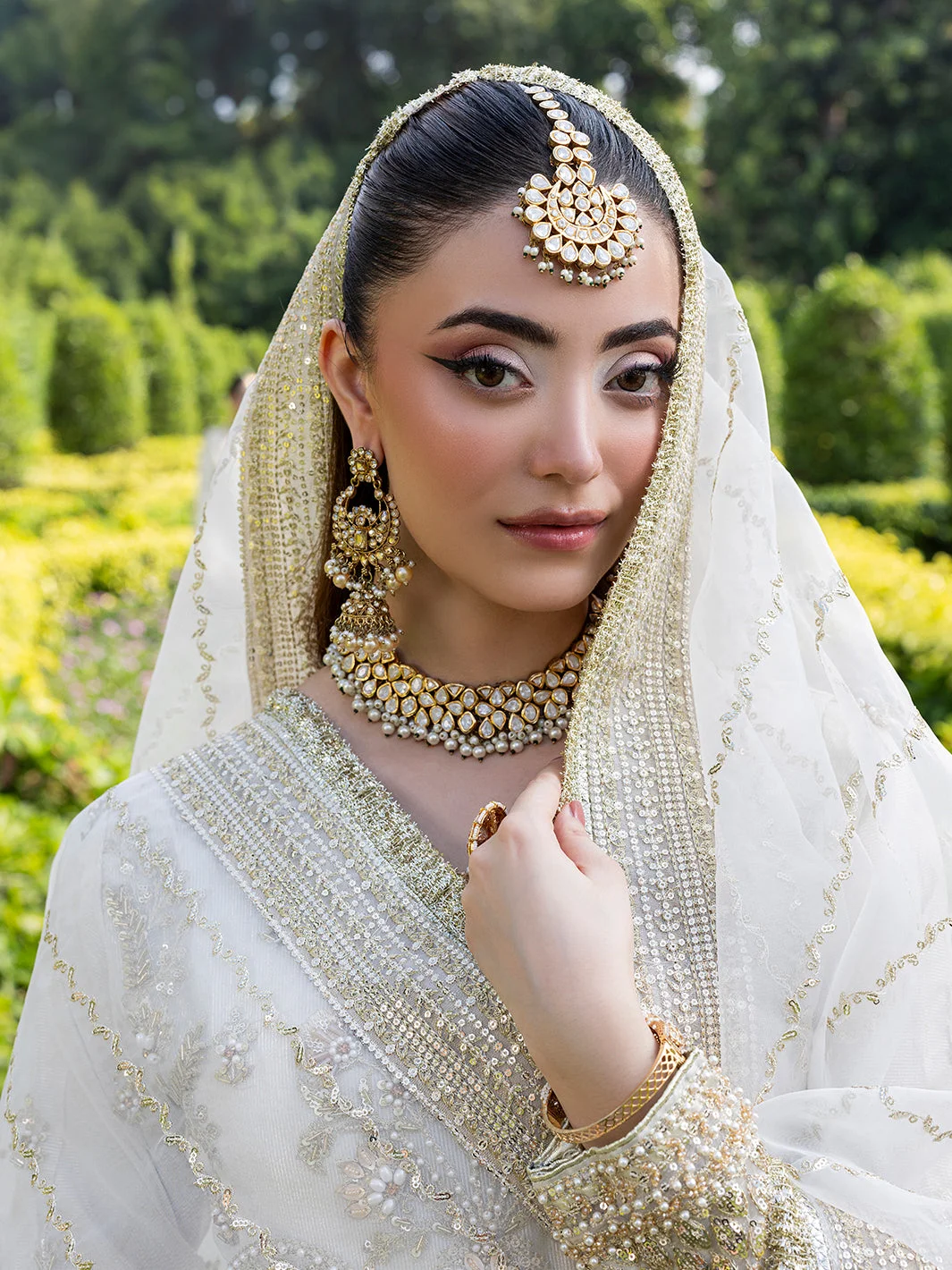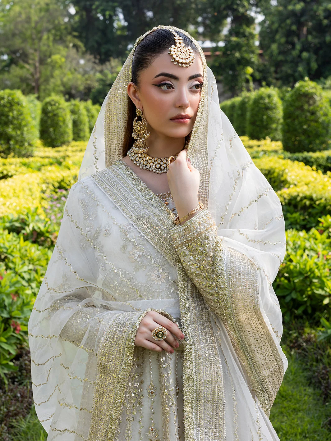 Pair this Pakistani designer fashion masterpiece with statement chandelier earrings in gold or kundan for a fully bridal-adjacent look. A sleek low bun or voluminous waves complement the maxi’s neckline beautifully. Opt for embellished heels in gold or nude to let the lehenga’s flare take centre stage.