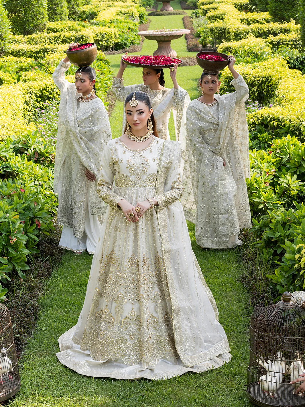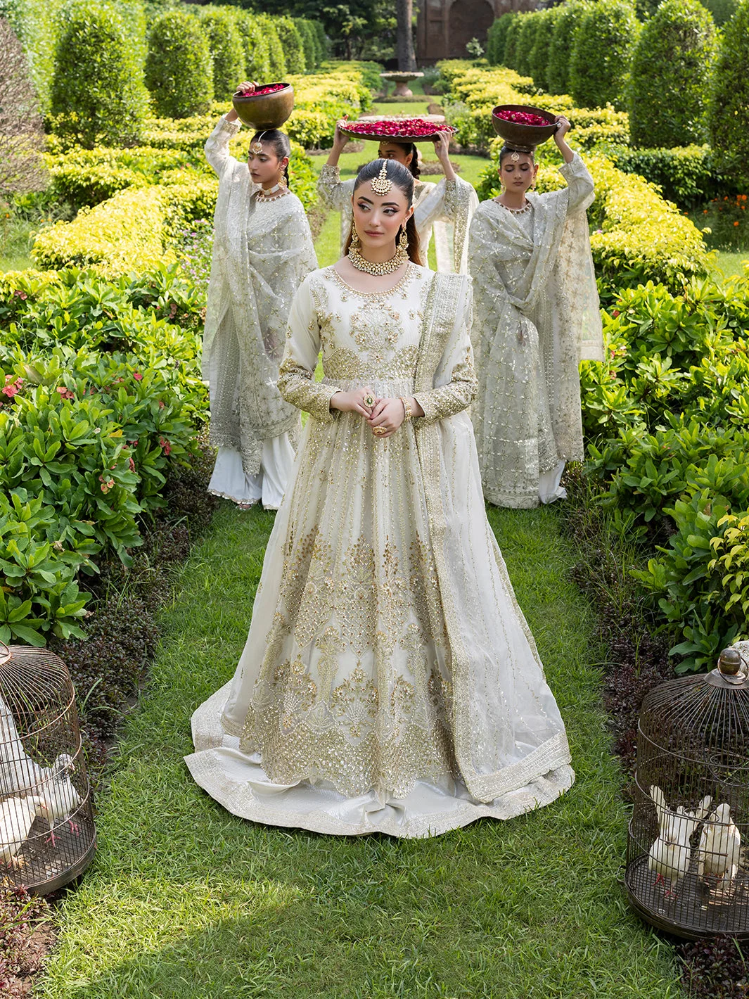 This exquisite formal wear set is a celebration of colour and couture artistry. The vibrant multi-hue palette brings together rich, jewel-toned shimmiri and organza fabrics that catch the light beautifully. Intricate tilla embroidery and zari work cascade across the maxi and lehenga, creating a visual symphony of traditional Pakistani motifs rendered in a thoroughly contemporary silhouette.