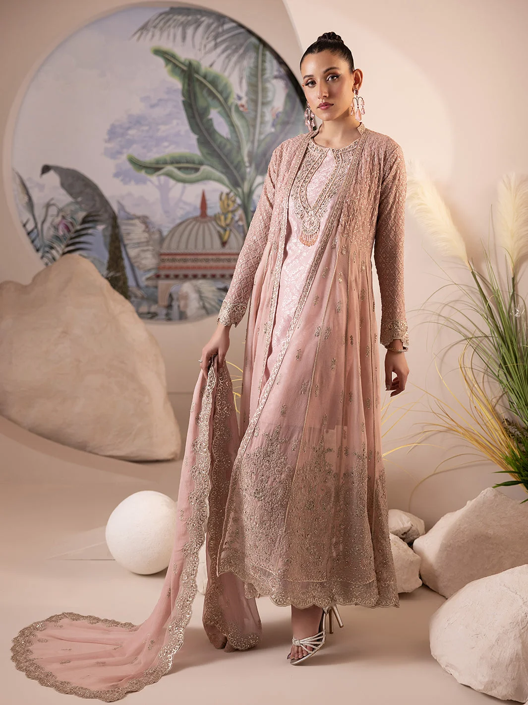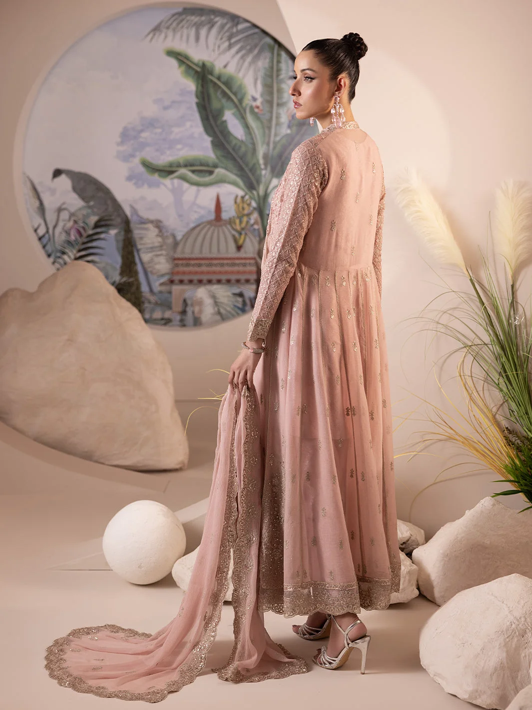 Pair this ShahJahan party wear gown with strappy heeled sandals in gold or nude to complement the peach tones. Statement earrings in antique gold will echo the stone work on the gown beautifully. Keep makeup warm and dewy — a peachy-nude lip with defined eyes lets the dress do the talking.