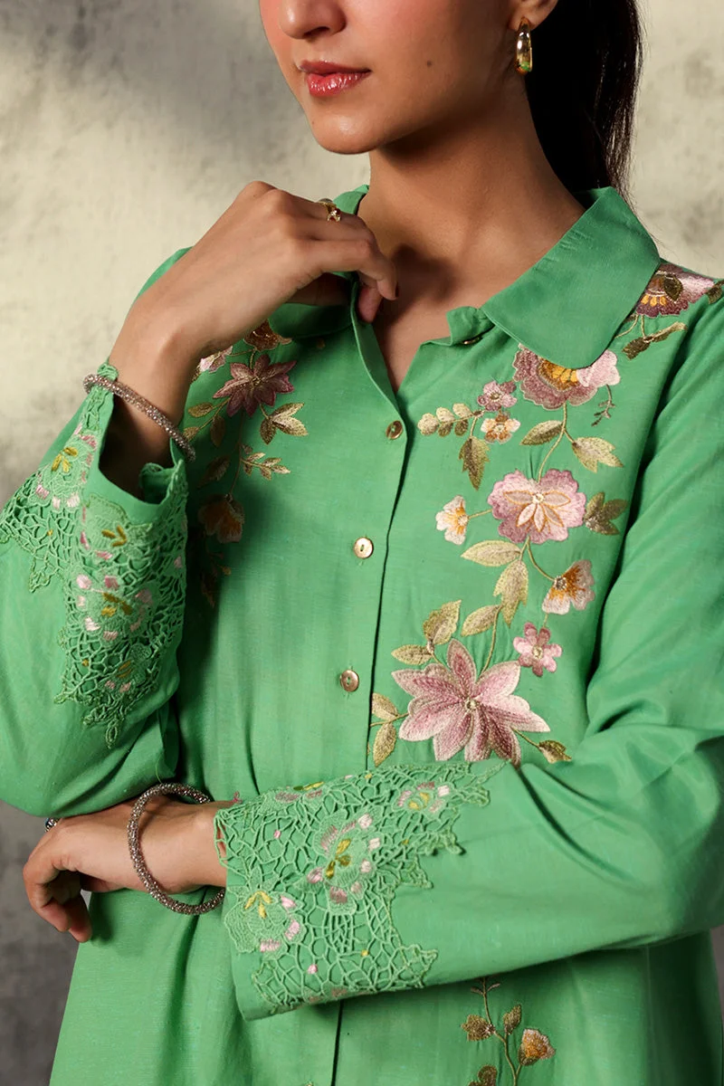 Elevate your formal wear wardrobe with the Summer 2026 Oriental Florals Button-Down Set — a sophisticated 2-piece ensemble crafted from luxurious Pakistani Raw Silk in a stunning Grape Green hue. Featuring an intricately embroidered button-down collared shirt paired with tailored culottes, this set is designed for the woman who commands attention at every festive, Eid, or wedding guest occasion. Authentic Summer 2026 collection, now available with free worldwide delivery.