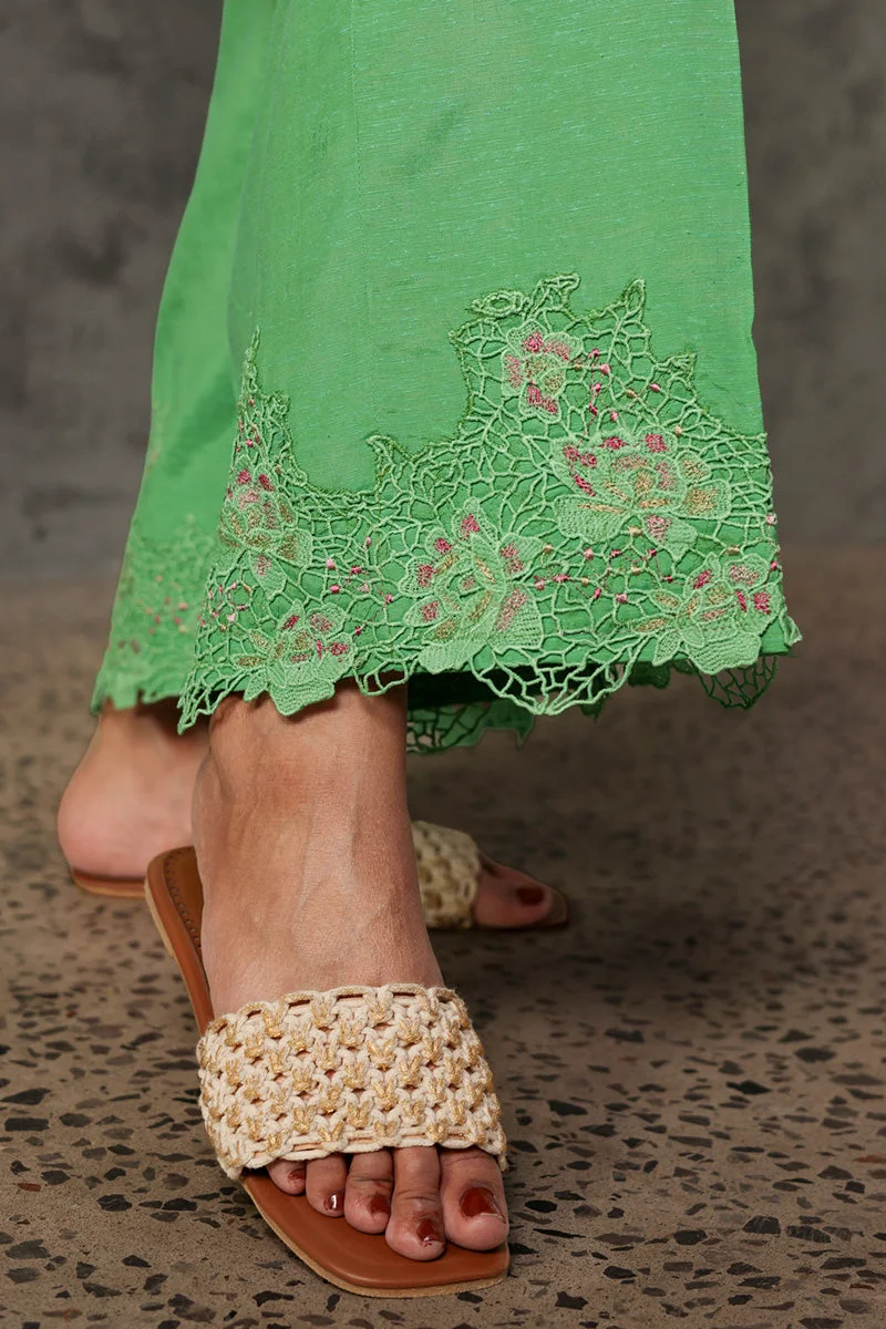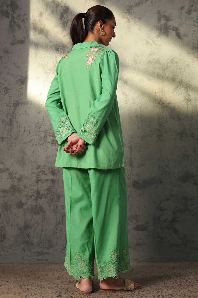 Pair this authentic Summer 2026 set with strappy heeled sandals in nude or gold to let the Grape Green shine. Opt for minimalist gold jewelry — chandelier earrings or a delicate choker work beautifully with the collared neckline. A structured clutch in a complementary tone completes the look effortlessly for any formal or festive occasion.